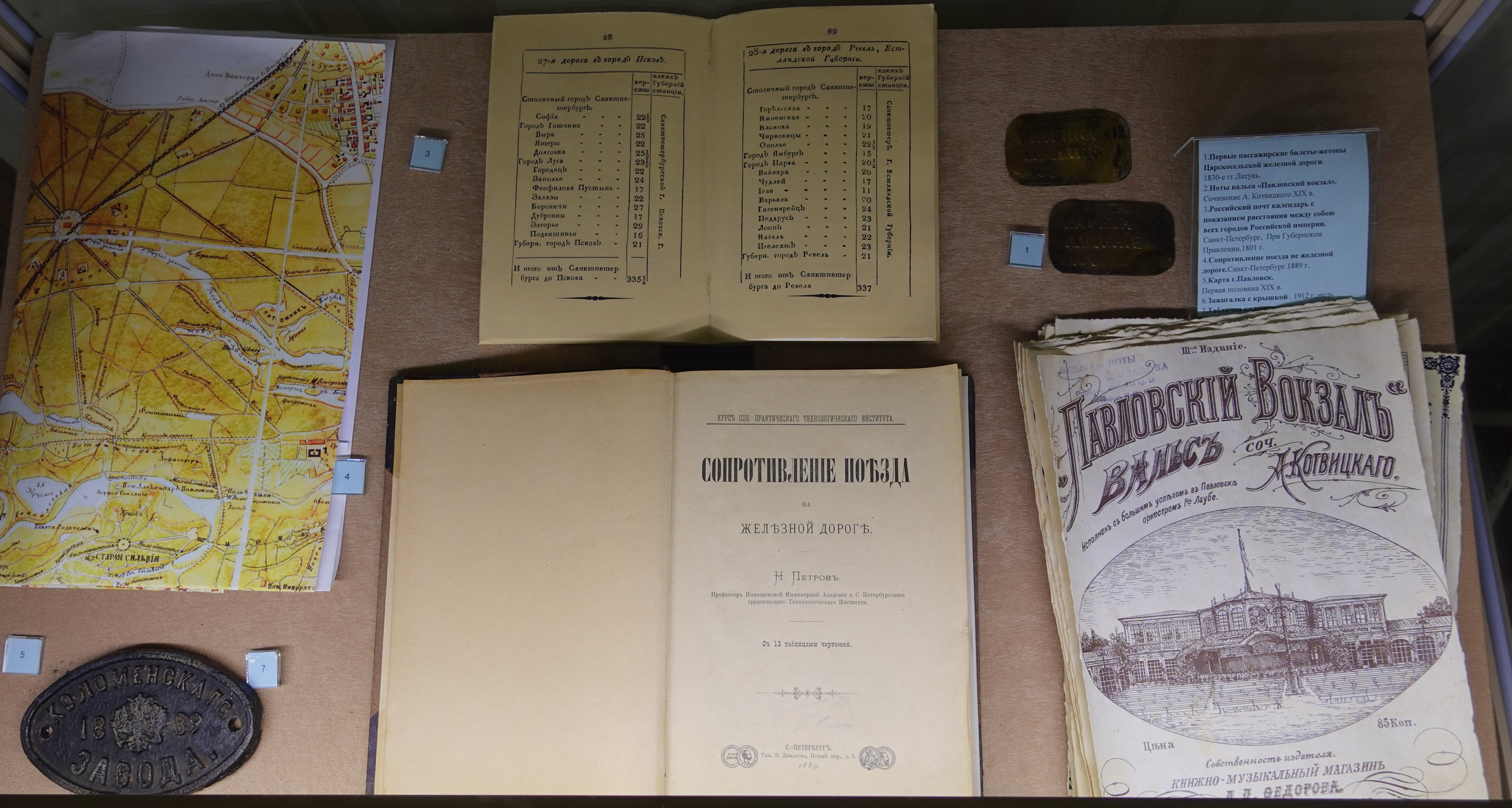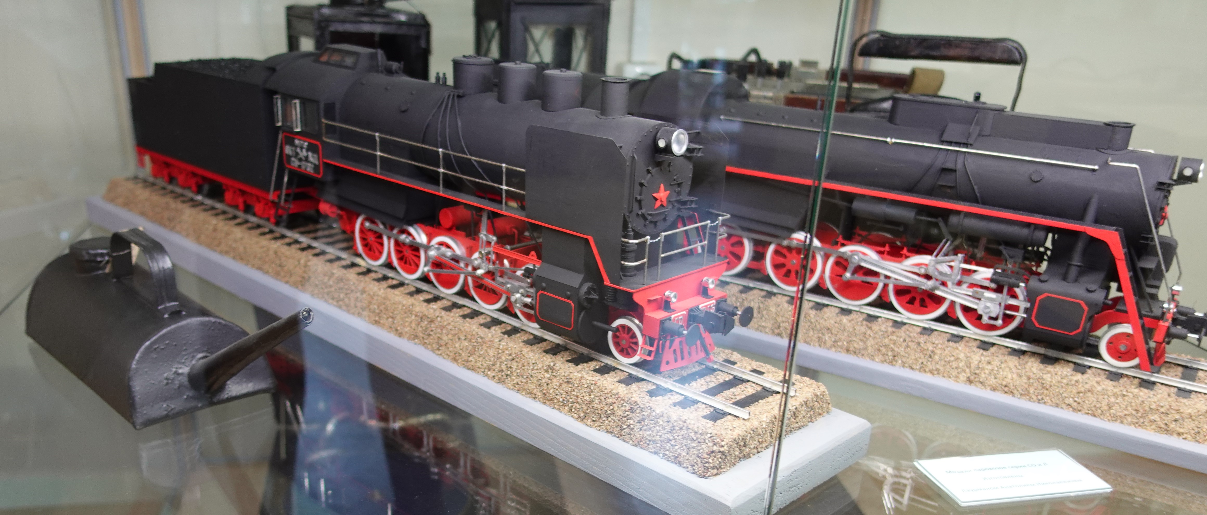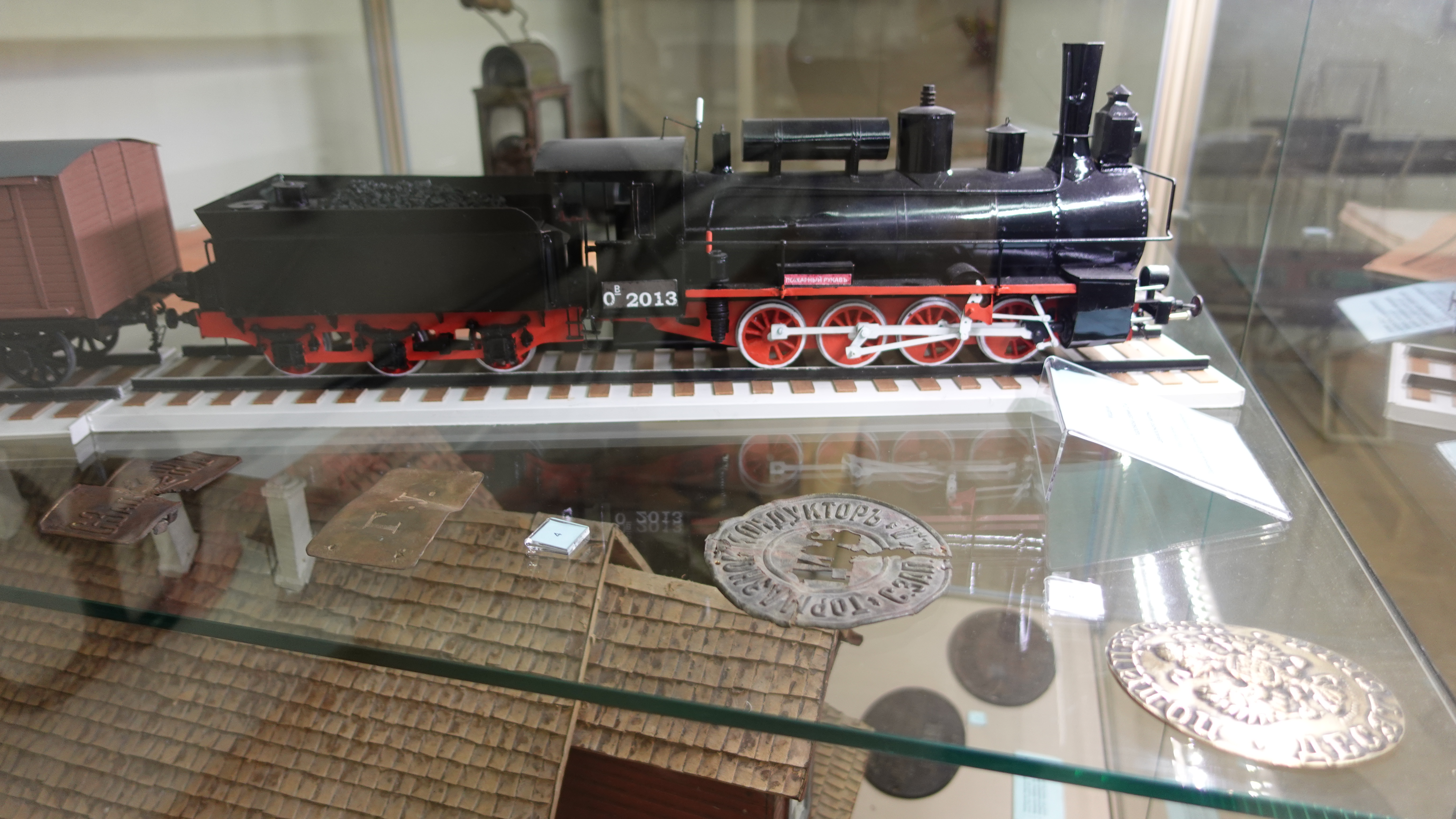 Витрина с моделями паровоза Ов и вагона НТВ