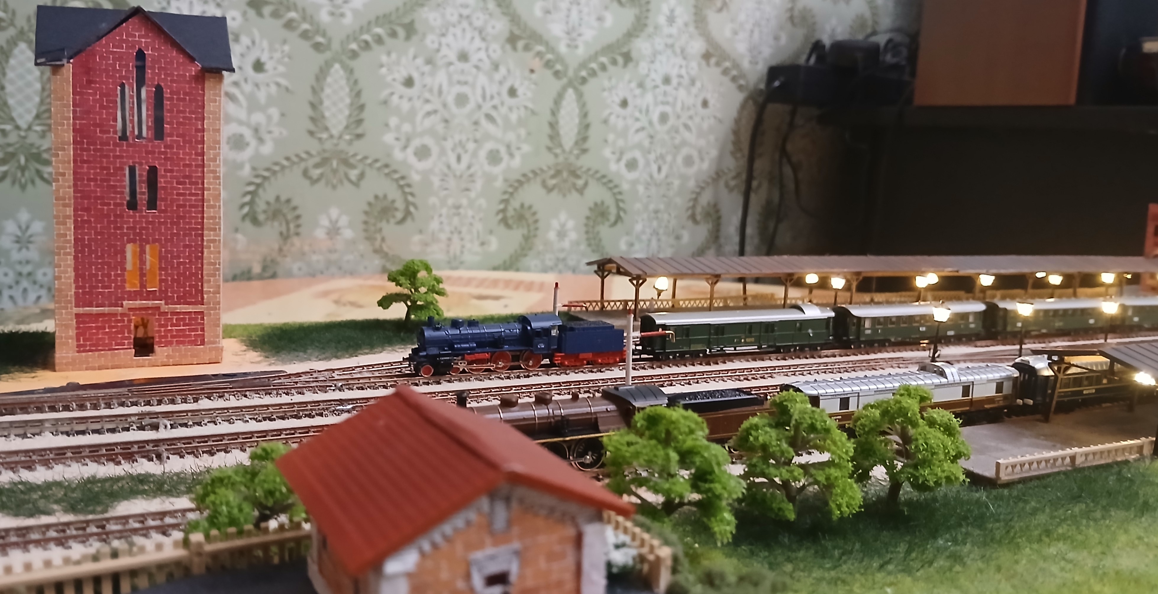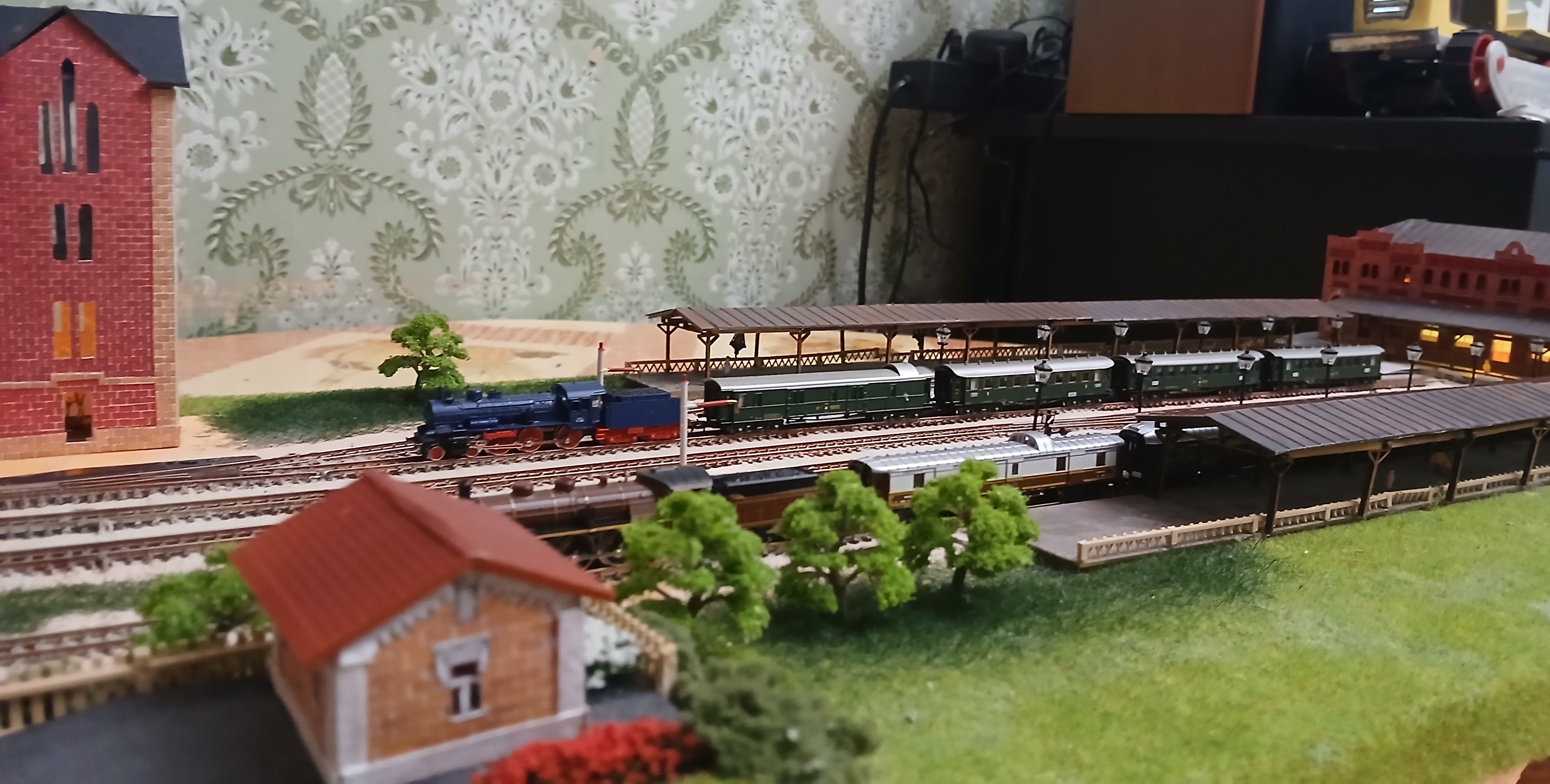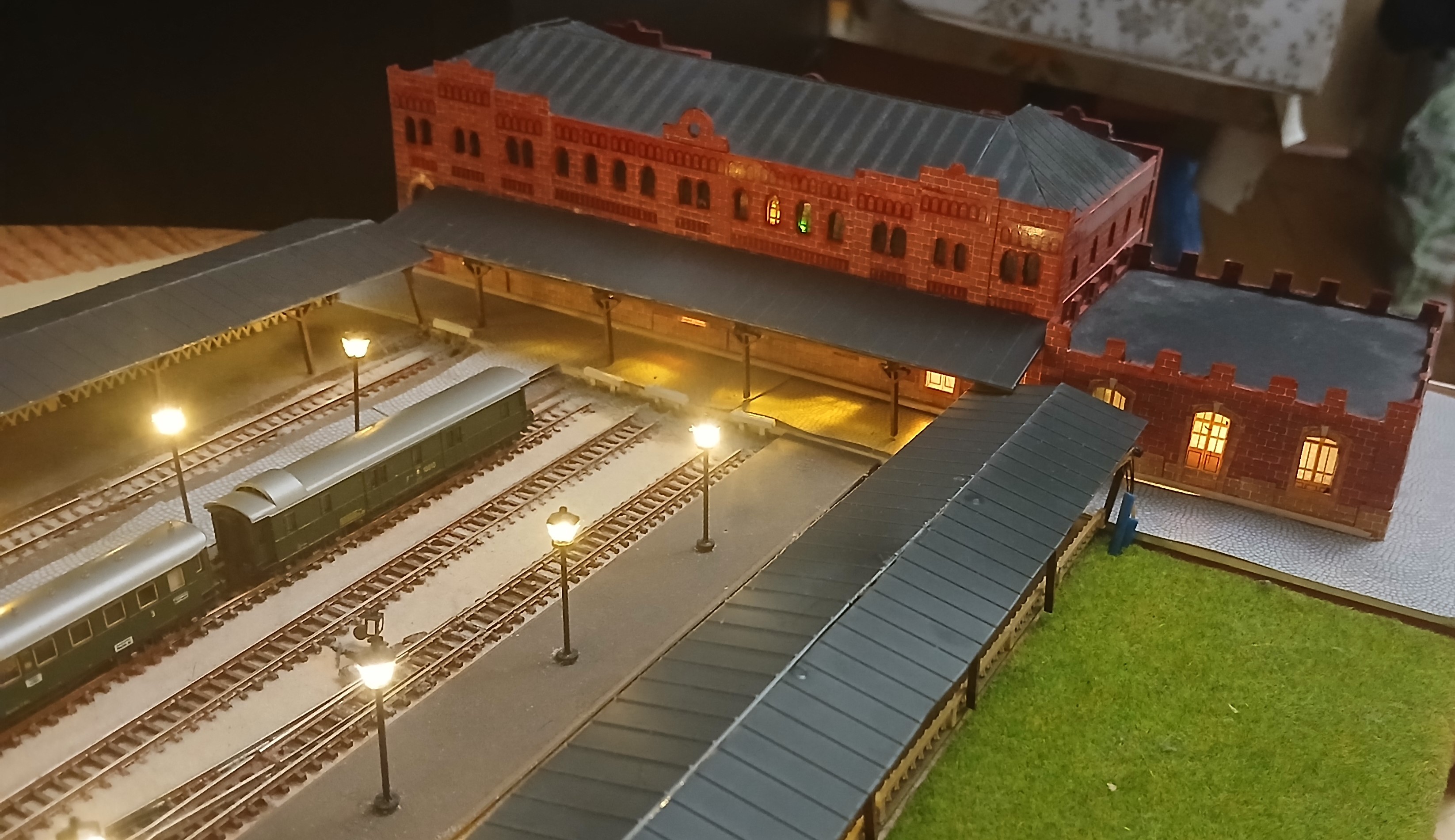 Старый вокзал в центре Таганрога - уникальное здание с многогранной полуторавековой историей. За прошедшие годы окружающее пространство изменилось до неузнаваемости. Неизменным осталось лишь само здание. Уже имея в свое арсенале постоенный макет этой станции, отражающий более-менее современную эпоху (начало 80-х годов), возникло желание обратиться к временам более ранним, тем более, что тогда станция была оборудована ажурным П-образным деревянным навесом, закрывающим от непогоды две бокоовые пассажирские платформы, а также водоемное здание, выполненное в готическом стиле не было перестроено. Ввиду ограниченности свободного пространства обратился к уже освоенному типоразмеру Z, масштаб уменьшения 1:220. Здание сделано из картона и бумаги. Деревянный навес из аутентичного материала. Детали были изготовлены методом лазерной резки. Фонари на платформе от фирмы "Sunshine model" Китай, декор самодельный при помощи матералов, купленных в магазинах сети "Леонардо". Для основы макета взят лист жесткого пенополистирола толщиной 12 мм. и размером 100х40 см. Такой формат вполне позволяет разместить макет на отдельной настенной застекленной полке. Путевая схема отражает развите станции по состоянию на начало ХХ века. Один из этапов процесса посторойки изображен на фото выше. Далее приведены фото готового макета с подвижным составом I-й эпохи. Использованы серийно выпускаемые модели фирмы "Marklin". Имитации водоразборных колонок полностью созданы с нуля. Линейно-путевое здание и водоемное здание выполнены из плотной бумаги. Управление макетом бепроводное на основе разарботанной мною системы, с которой можно подродно ознакомиться здесь: Система беспроводного управления аналоговыми макетами