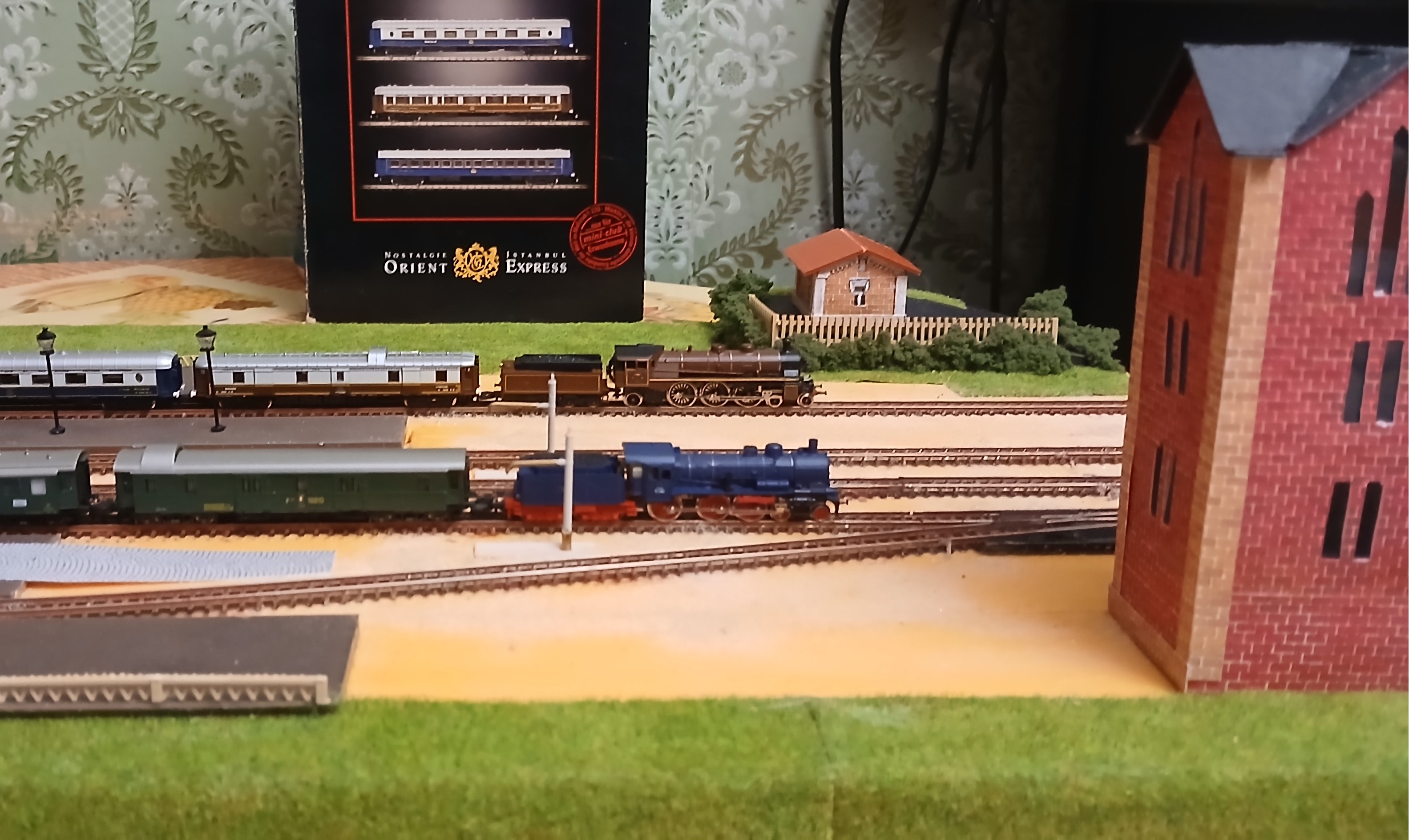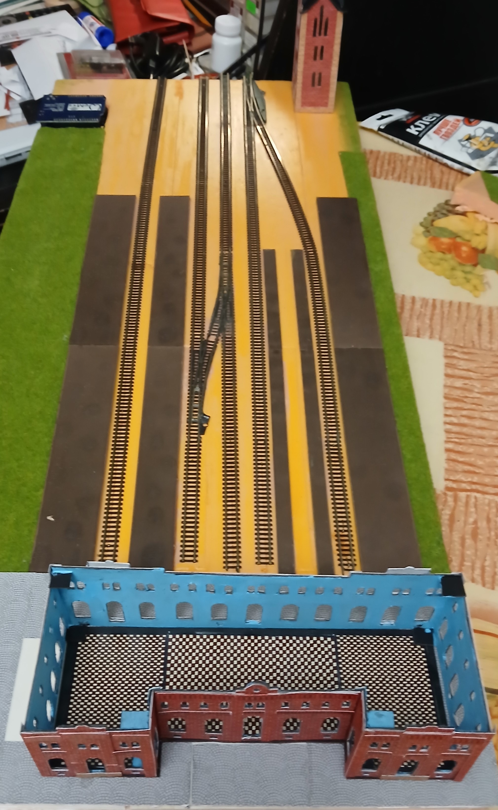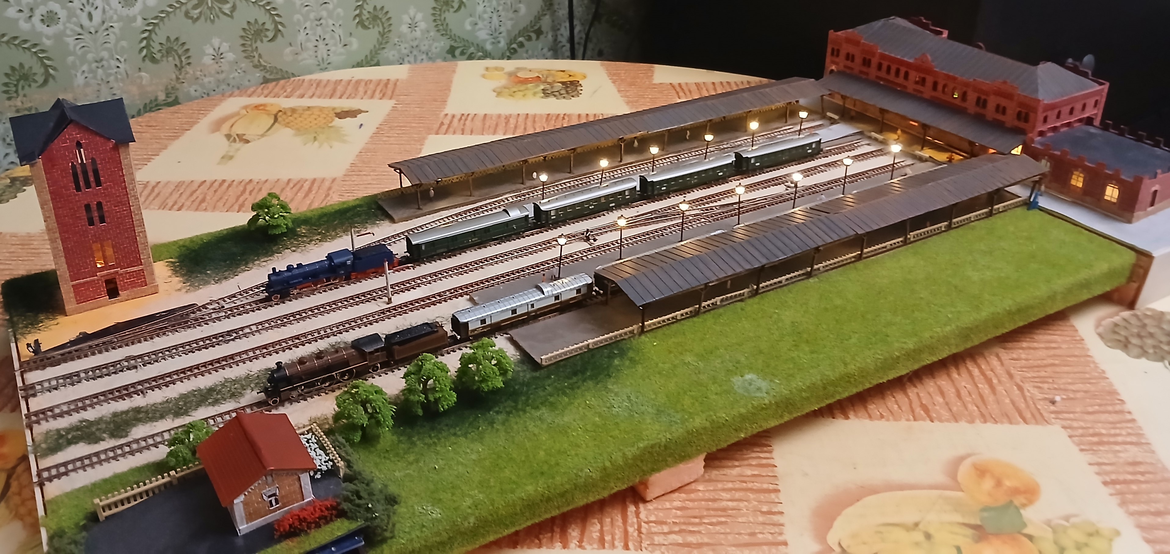Старый вокзал в центре Таганрога - уникальное здание с многогранной полуторавековой историей. За прошедшие годы окружающее пространство изменилось до неузнаваемости. Неизменным осталось лишь само здание. Уже имея в свое арсенале постоенный макет этой станции, отражающий более-менее современную эпоху (начало 80-х годов), возникло желание обратиться к временам более ранним, тем более, что тогда станция была оборудована ажурным П-образным деревянным навесом, закрывающим от непогоды две бокоовые пассажирские платформы, а также водоемное здание, выполненное в готическом стиле не было перестроено. Ввиду ограниченности свободного пространства обратился к уже освоенному типоразмеру Z, масштаб уменьшения 1:220. Здание сделано из картона и бумаги. Деревянный навес из аутентичного материала. Детали были изготовлены методом лазерной резки. Фонари на платформе от фирмы "Sunshine model" Китай, декор самодельный при помощи матералов, купленных в магазинах сети "Леонардо". Для основы макета взят лист жесткого пенополистирола толщиной 12 мм. и размером 100х40 см. Такой формат вполне позволяет разместить макет на отдельной настенной застекленной полке. Путевая схема отражает развите станции по состоянию на начало ХХ века. Один из этапов процесса посторойки изображен на фото выше. Далее приведены фото готового макета с подвижным составом I-й эпохи. Использованы серийно выпускаемые модели фирмы "Marklin". Имитации водоразборных колонок полностью созданы с нуля. Линейно-путевое здание и водоемное здание выполнены из плотной бумаги. Управление макетом бепроводное на основе разарботанной мною системы, с которой можно подродно ознакомиться здесь: Система беспроводного управления аналоговыми макетами