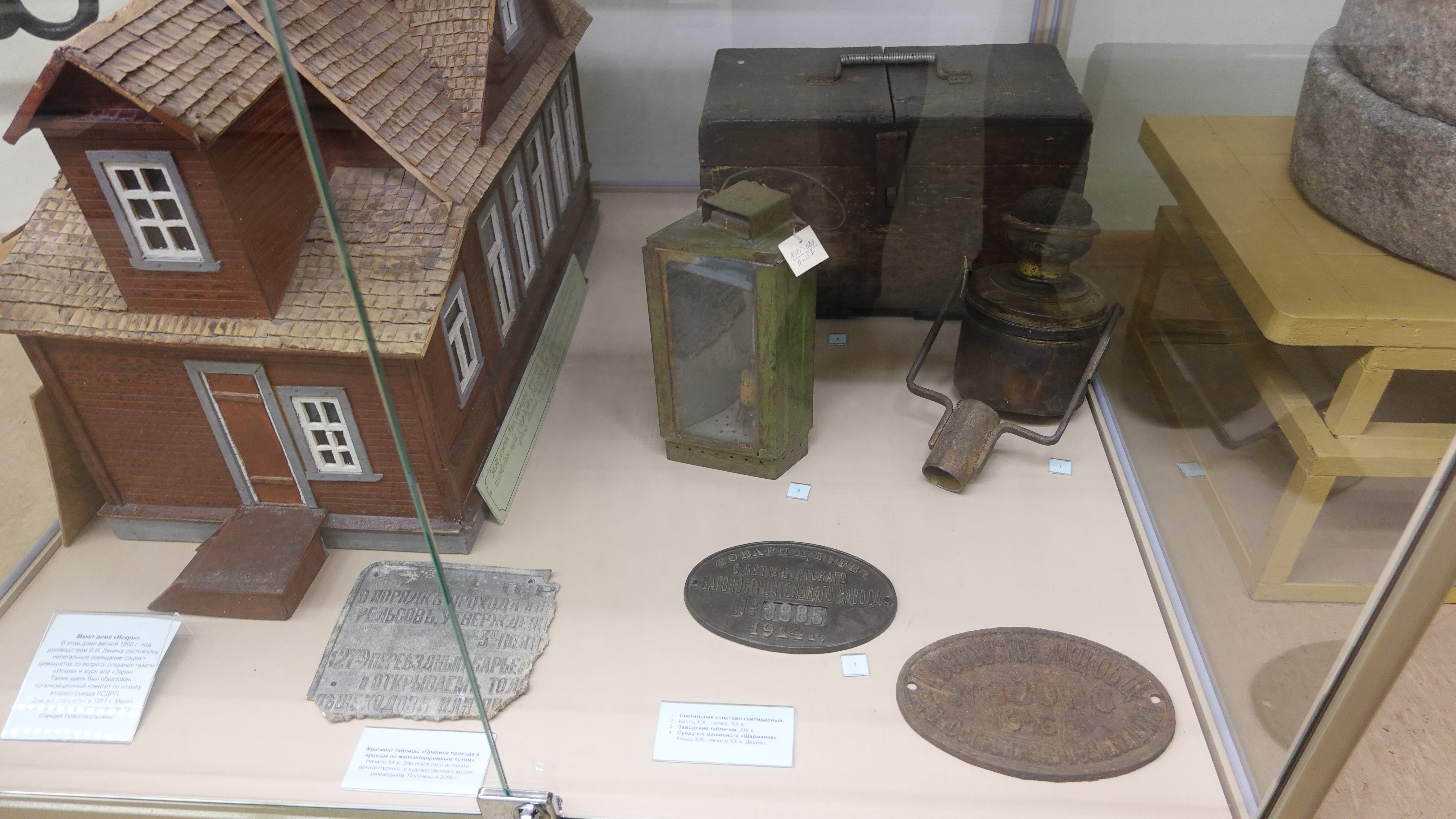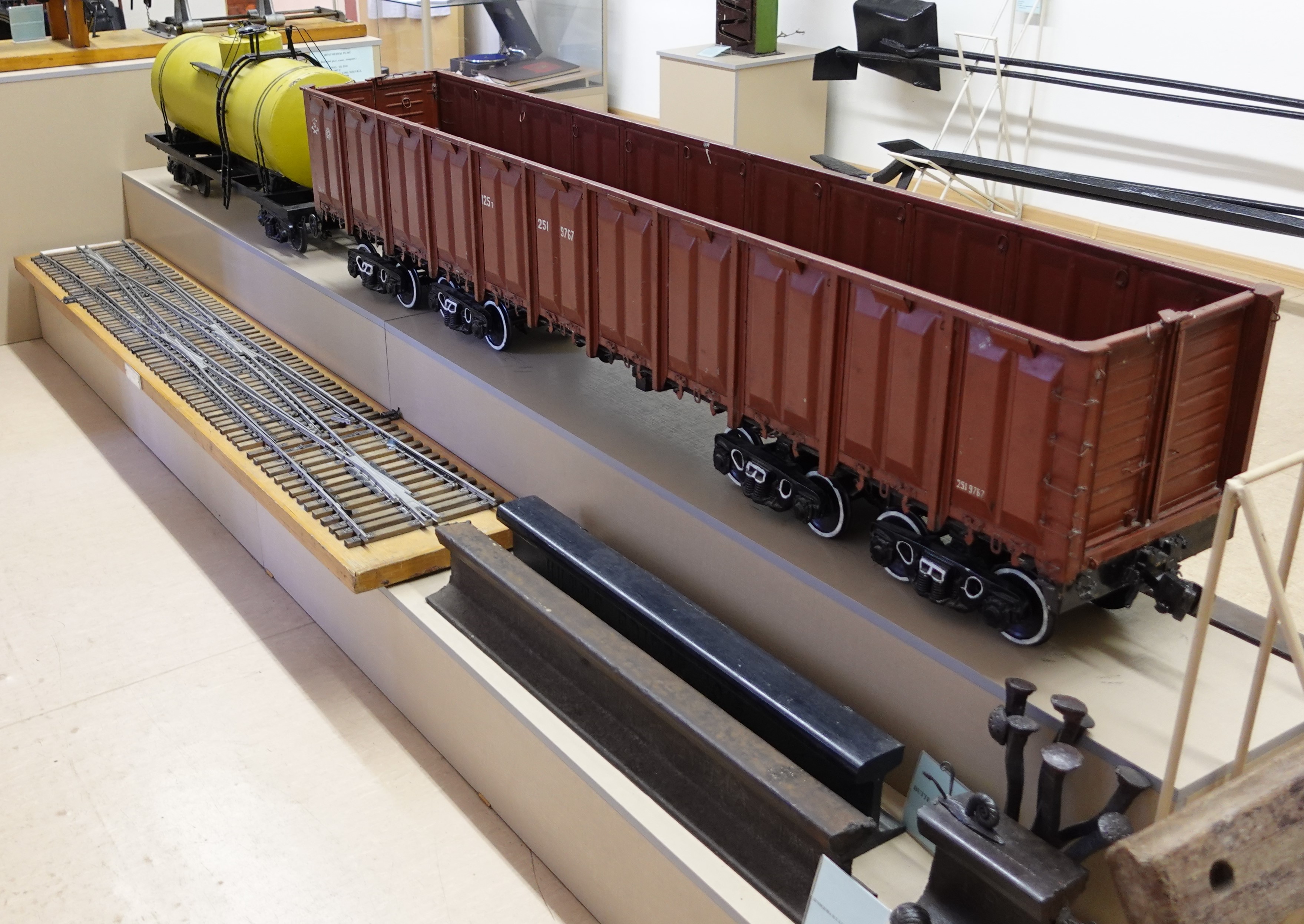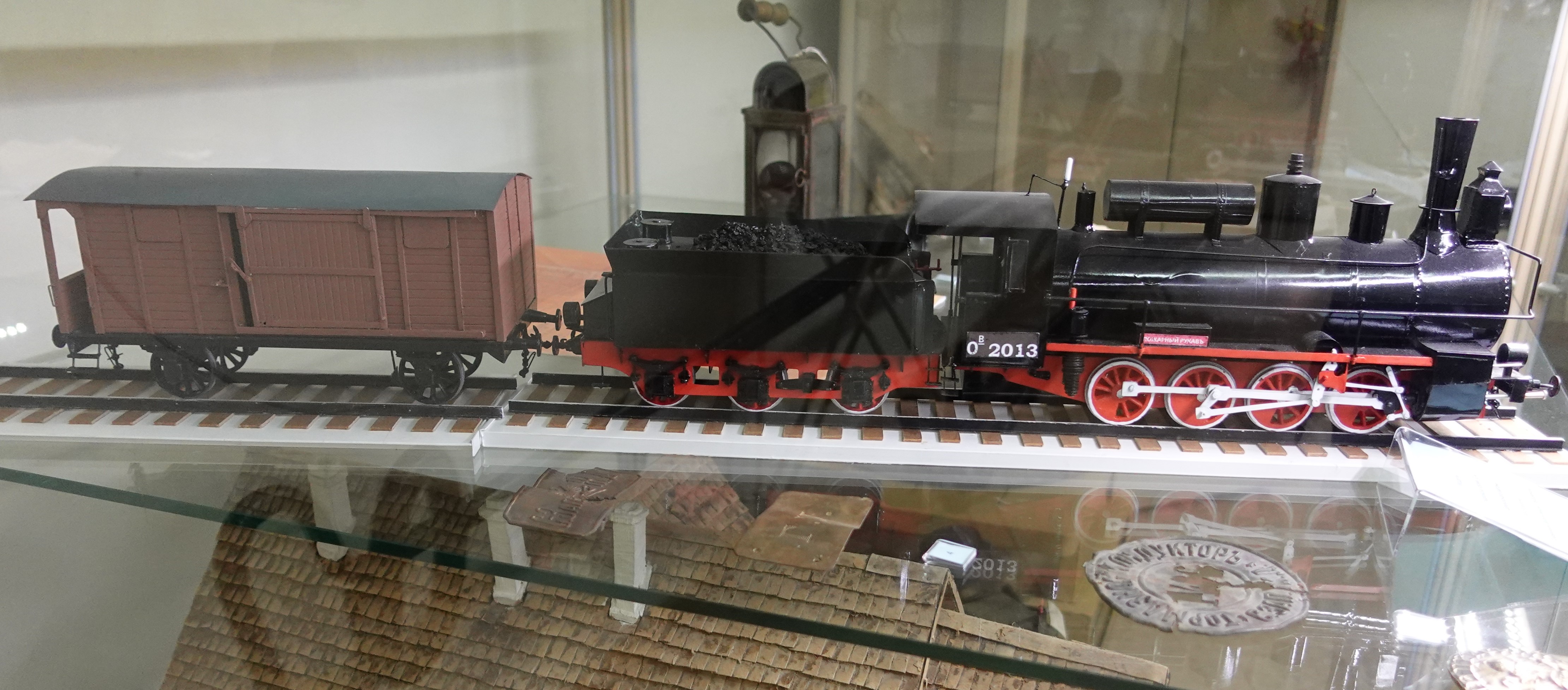 Витрина с моделями паровоза Ов и вагона НТВ